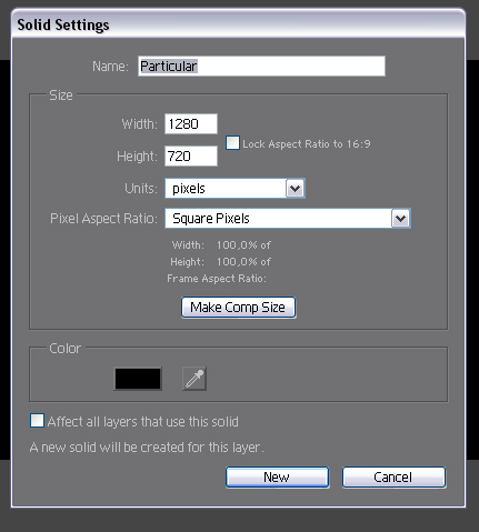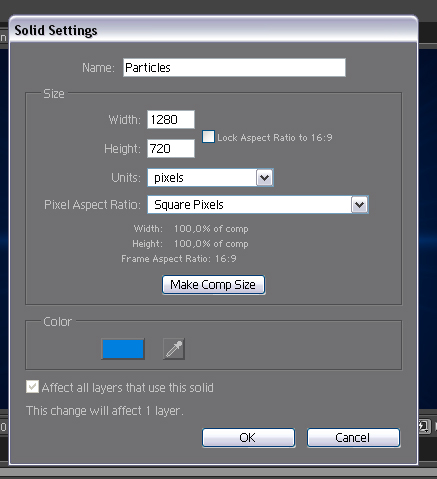 Now let’s go back to our Batman animation.We need a cool background animation because this black background is a little bit flat and simple.Create a new solid clicking by Menu->Layer->New->Solid. Change the color to #2C7EDB. Make it comp size (1280*720) and name it as ‘Particles’.