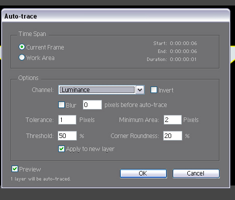 With the batman logo layer selected go to Layer->Auto trace.Change the channel propertie to Luminance and turn on the preview checkbox to see the final result.Kepp that it you don’t need too many anchor points so just leave the Threshold, Tolerance, Minimum Area and Corner Roundness on default.