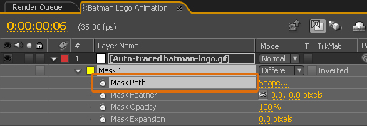 So we have a new layer as you can see.You can delete the original layer because we don’t need it anymore.Hit the "m" key twice on the keyborad to reveal the mask properties.Select the Mask Path and hit ctrl+c or go to Edit->Copy.