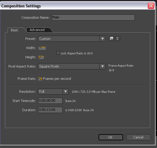 Create a new composition clicking by Menu->Composition->New Composition. Name it as Main, change the resolution to 1280×720 and set the duration to 13 seconds.