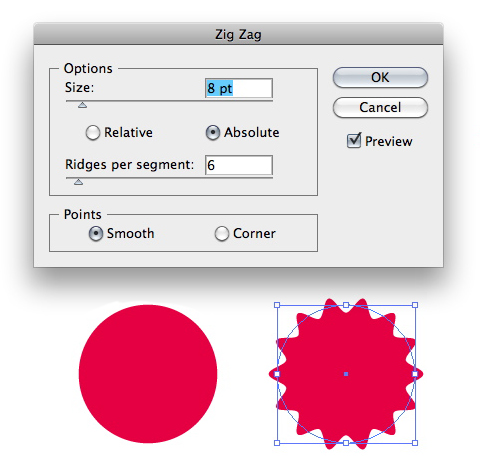 Draw a circle, about 100-point radius, using the Ellipse tool (L). Fill it with a bright red color, and set the stroke to none. Go to Effect > Distort & Transform > Zig Zag. Enter the values shown in the image below, and choose Smooth points.