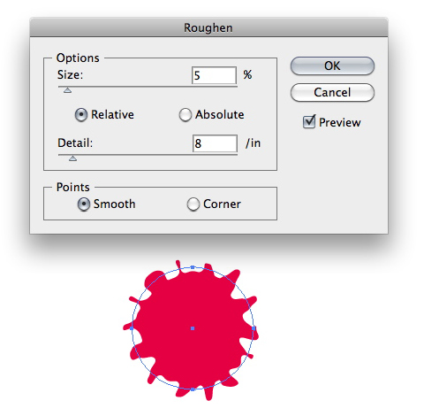 With the circle still selected, go to Effect > Distort & Transform > Roughen. Enter approximately the same values as before, so that the circle now looks like a paint splat.