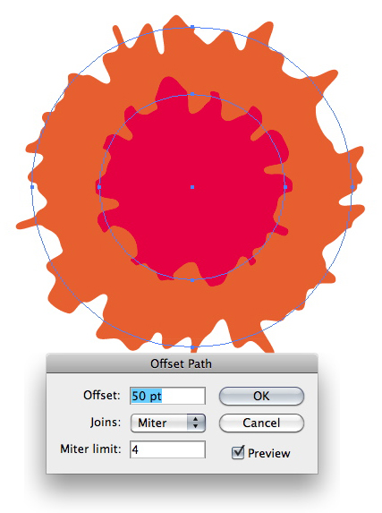 Keep the circle selected, and go to Object > Path Offset Path. Enter 50 points for the offset. Your new circle should have the same appearance (zig-zagged and roughened) as the original. If not, click the Graphic Style you just created to apply it. Change the offset circle’s color to a bright orange.