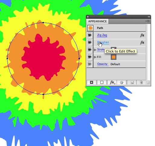 Keep warping the different colored-shapes. You can drag outwardly to create spikes, and inward to create valleys. You may wonder why I had you expand the appearance after applying the Roughen effect, then warp. To answer that question, do not expand the appearance, then use the Warp Tool. You get some pretty trippy shapes. But hey, it’s tie-dye &mdash trippy is part of the aesthetic. If you like it, use it.