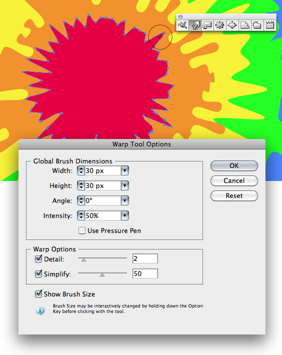 Choose the Warp Tool (Shift-R) and adjust its size by holding down the Alt key while dragging on the Artboard. Hold down the Shift key to constrain the width and height. Alternately, you can double-click the tool in the Tools panel to adjust its settings. Select the red blob, and drag out the spiky shapes with the Warp Tool. If the effect is too strong, or too weak, adjust the intensity in the Warp Tool Options (double-click the tool in the Tools panel).