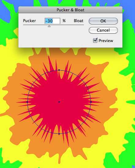 Select the red shape and go to Effect > Distort & Transform > Pucker & Bloat. Enter a slight Pucker, no more than -15. Do the same with the other colors, adjusting the effect as you go. Try to avoid symmetry &mdash just like real tie-dye, the effect should be random. Your illustration should now look something like the image below.