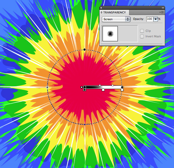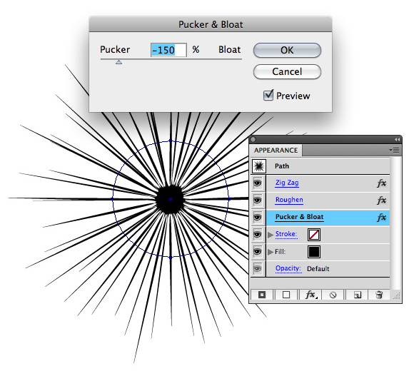 In real tie-dye, sometimes you’ll see areas of white where the dye did not penetrate. To mimic this effect, create one last circle and apply your Graphic Style. Add a Pucker effect until the center mass is very small, as in the image below.