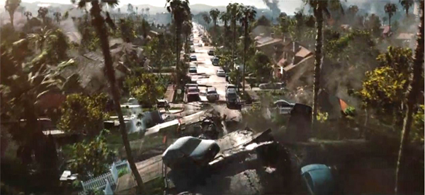 Many of the VFX scenes were left to their imagination. In the scene of the L.A. Earthquake, it was in the script as only four lines that said they drive through Los Angeles to Santa Monica’s Airport while the city is being destroyed. This entire scene was done on computer.. this means the entire residential neighborhood, a business district… In the computers you don’t have limitations for example when a parking structure starts to collapse and the limousine pass through it, that’s a great scene.