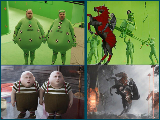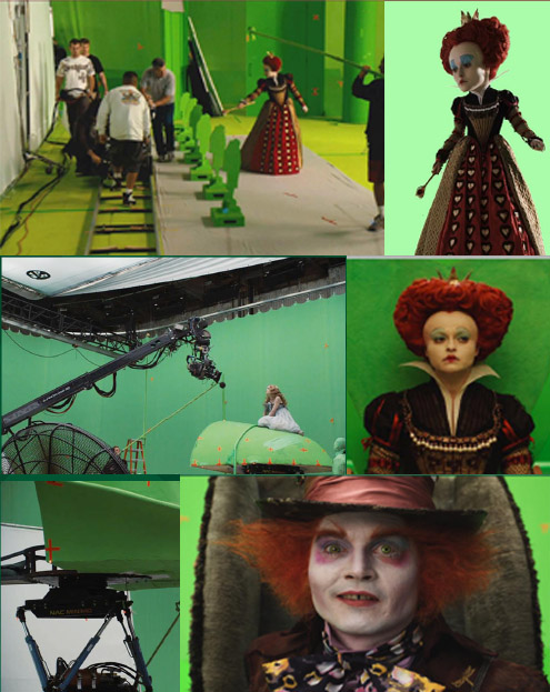 This is one of the most famous techniques used in films; it involves the removal of a color in order to add backgrounds that are entirely constructed using computer-generated imagery. Alice in Wonderland presents a fantastic world with imaginative characters. So when Alice is in this world, nothing is real—everything is filmed on a green screen. This includes not only the environment, but also the people—the technicians, the mechanical effects crew, and anyone else who was visible in frame were all in green too.