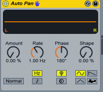 The Auto Pan originally offers LFO-driven manipulation of amplitude and panning for creating automatic panning, and amplitude modulation, and beat-synchronized chopping effects. Auto Pan’s LFOs modulate the amplitude of the left and right stereo channels with sine, triangle, sawtooth down or random waveforms.