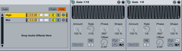 So now duplicate our auto pan device which we had created earlier. Set the rate knob 1/16 in the first one and 1/8 to second one. Now group them and duplicate the chain and rename the first one to high and mid the last one. Now we have two channel vibrato.