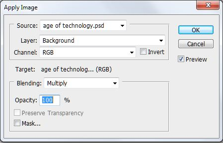 So create a new layer, leaving it blank. Go to image > apply image, and set this values: (if you are working on CMYK, channel will be CMYK, so don’t worry.)