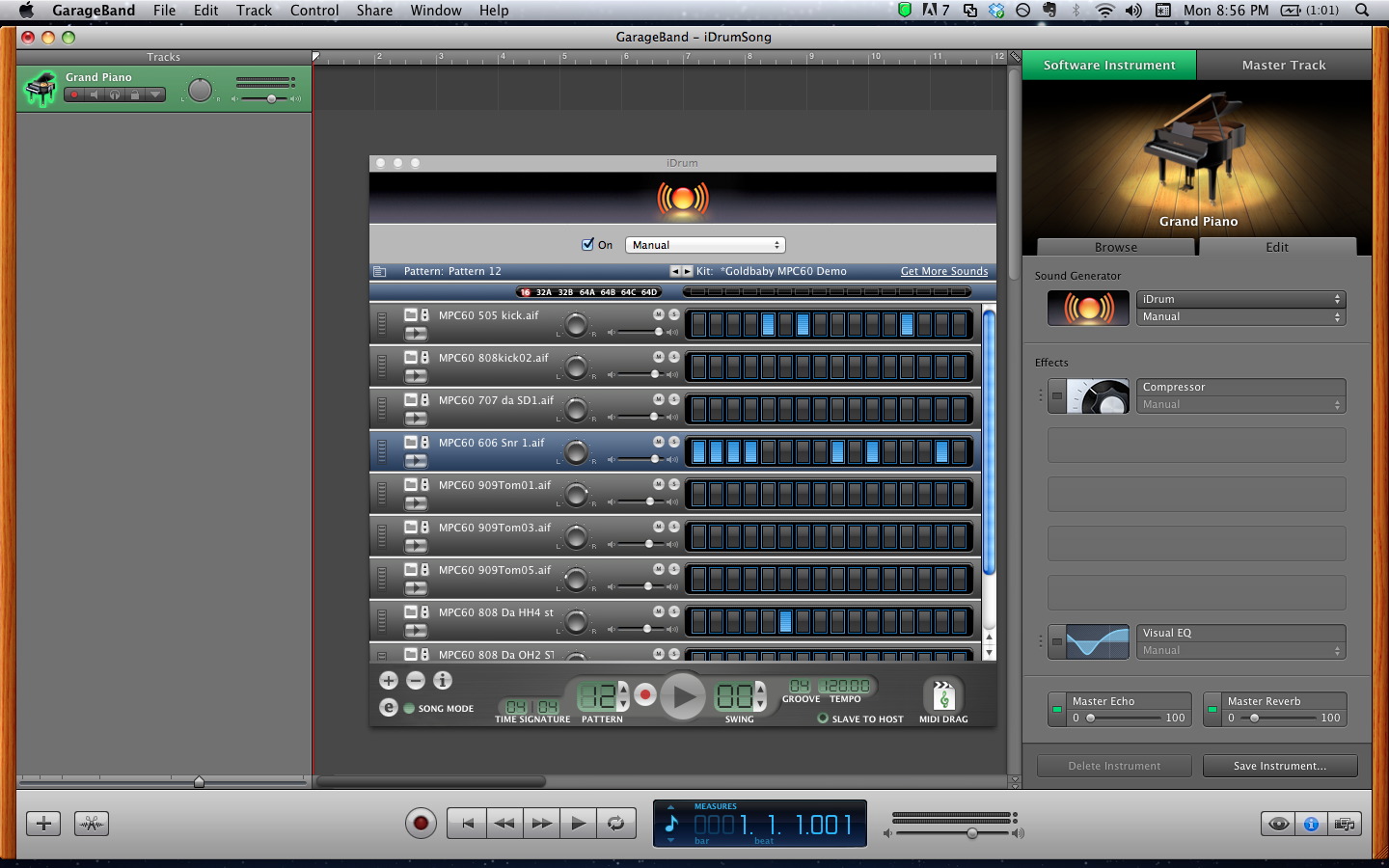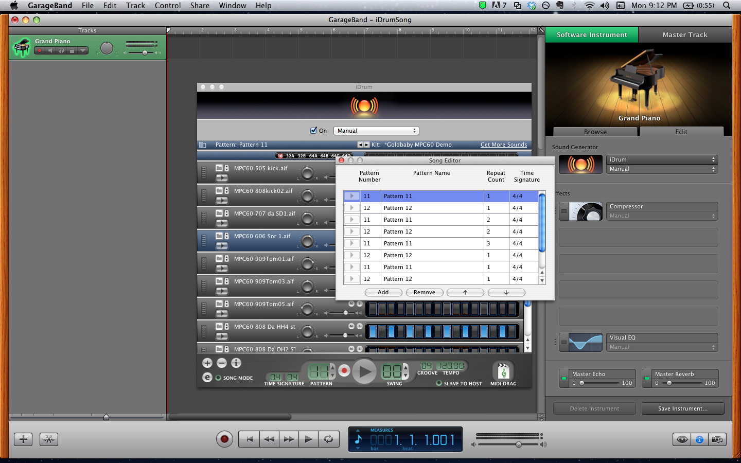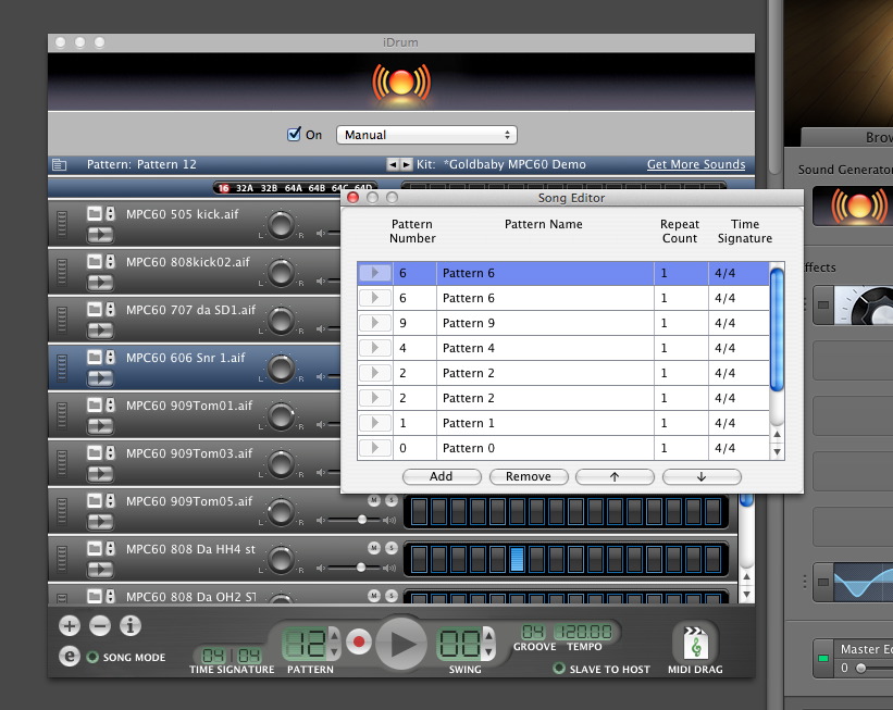 With the iDrum plugin window open, you can make beat patterns and do other adjustments. There are are some built in patterns, but I’m going to go to some vacant pattern numbers and make a couple of beats with the Goldbaby MPC60 Kit.