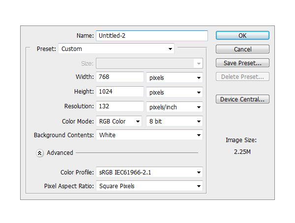 Create a new file. Set Width to 768 and Height to 1024 and the resolution to 132 PPI.