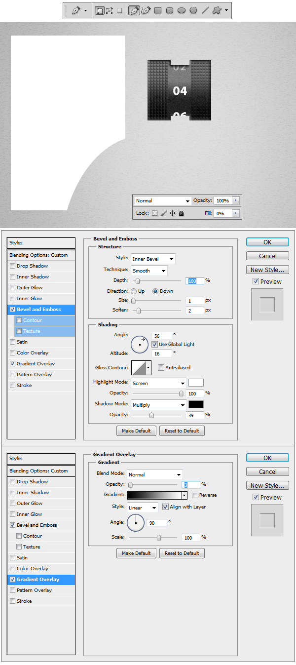 After creating a new layer and transforming it into a Clippin Mask, use Rectangular Tool (U) and make a shape like the one in the example. Set the fill color to #484848 and apply the Layer Styles. Create a new layer and using Horizontal Type Tool (T) set the Font to Myriad Pro (standard font) /Bold and font size to 14 pt and write the numbers 02, 04 and 06 exactly like in the example and apply the Layer Styles. Make another layer and transform it into a Clippin Mask. Create another shape lik the first one, Filter > Noise > Add noise and set the Amount to 400, Distribution to Uniform and check the Monochromatic box. Set the Opacity level to 5% and move to the next step.