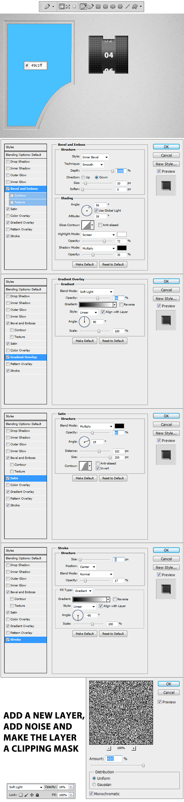 Using Pen tool (P) make another shape and set the color fill to #49c1ff and apply the Layer Styles. Create a new layer, fill the layer with any color that you like, go to Filter/Noise/Add noise and set the Amount to 400%, Distribution to Uniform and check the Monochromatic box. Transform the layer in a Clipping Mask and set the blending mode for the layer to Soft light and the Opacity level to 14%.