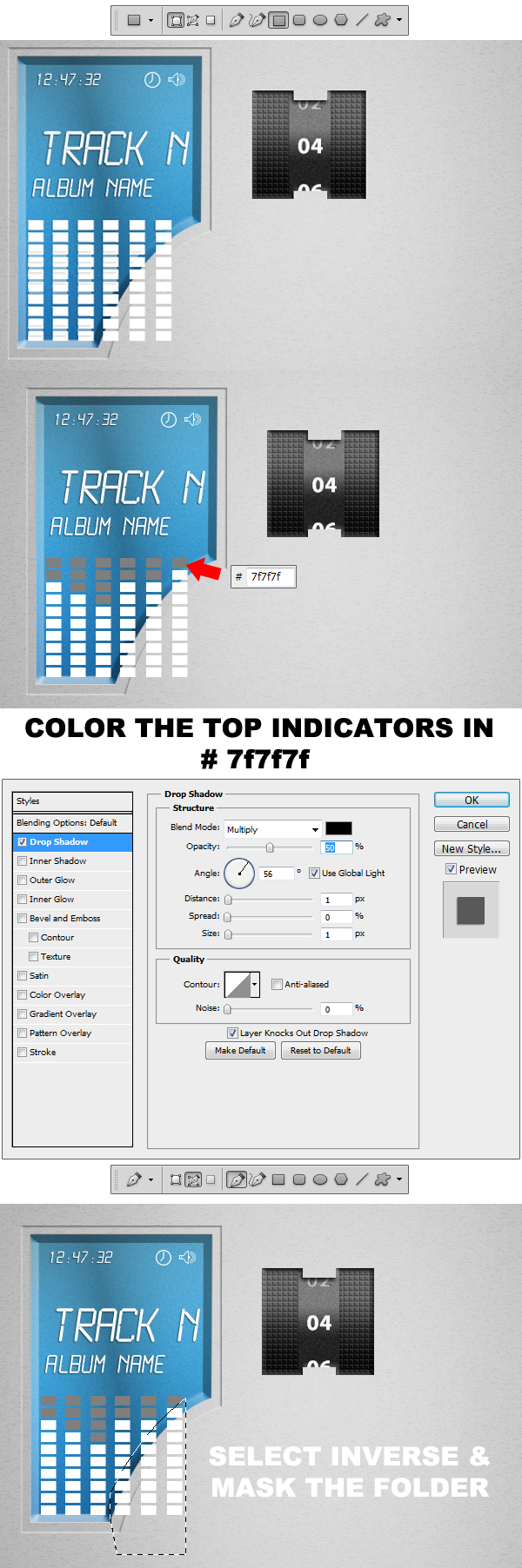 Now, using Rectangular Shape Tool (U) draw 60 white #ffffff rectangles like in the example. Change the color to some of them to #7f7f7f and apply the Layer Style. Put all those layers in one group and name it Indicators. Now using Pen Tool (P) set to paths make a selection just like the one in the example, select inverse and add a mask to the group.