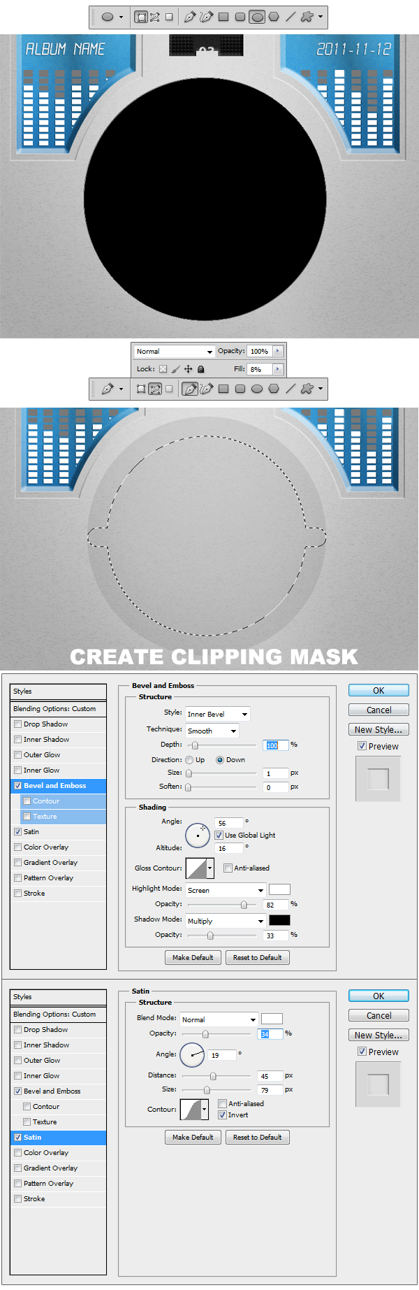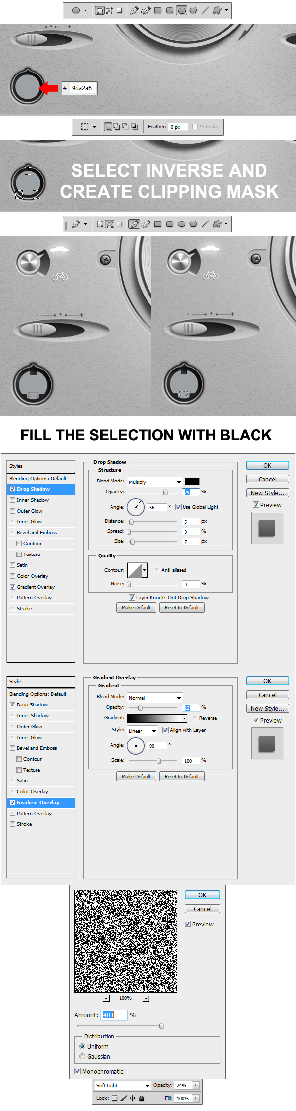 Using Ellipse Tool (U) make a circle like the one in the example and set the fill color to #9da2a6. Select Rectangular Marquee Tool (M) and make 3 selections like the ones in the example, select inverse and add layer mask. Now select Pen Tool (P) set it to Paths and make a selection path just like the one in the example. Select the layer mask thumbnail from our circle layer and fill the selection with black #00000 and apply the Layer Styles. Make a new layer fill it with any color, go to Filter > Noise > Add noise and set the Amount to 400%, Distribution to Uniform and check the Monochromatic box. Transform this layer in a Clipping Mask, set the blending mode for the layer to Soft Light and the Opacity level to 24% and we are ready to move to our next step.
