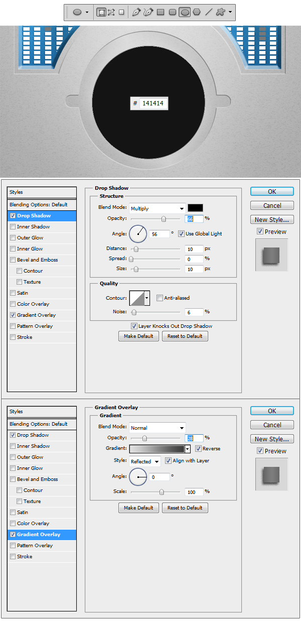 Using Ellipse Tool (U) make another circle inside the previous shape, set the color fill to #141414 and apply the Layer Styles.
