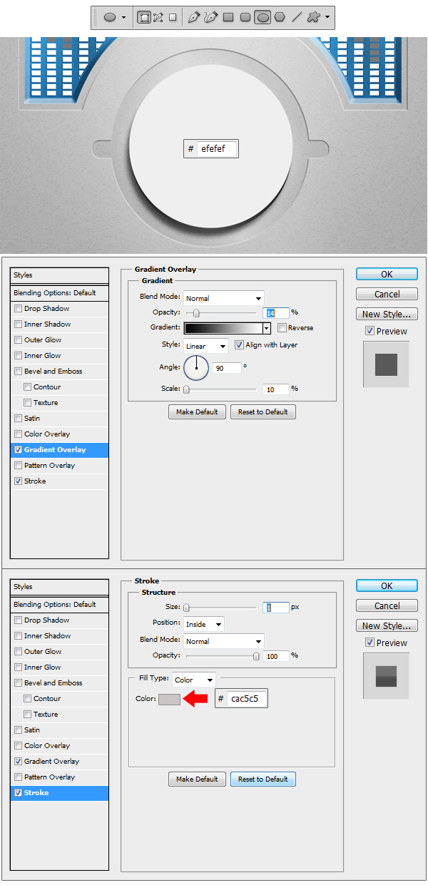 Make another circle using Ellipse Tool (U), set the color fill to #efefef and apply the Layer Styles.