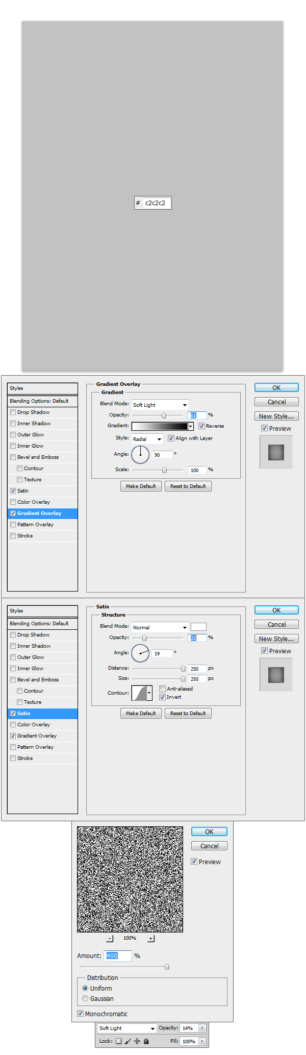 Make a new Group and name it Background. Inside that group create a new layer and fill it with #c2c2c2 and apply the Layer Styles. Make another layer, fill it with any color that you like than go to Filter > Noise > Add noise and set the Amount to 400%, Distribution to Uniform and check the Monochromatic box. Set the blending mode for the layer to Soft light and the Opacity to 14%.