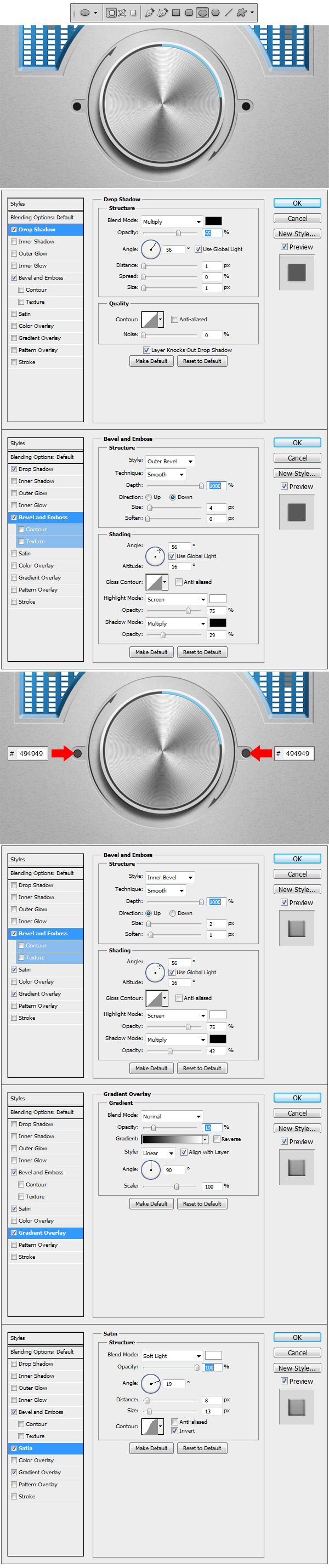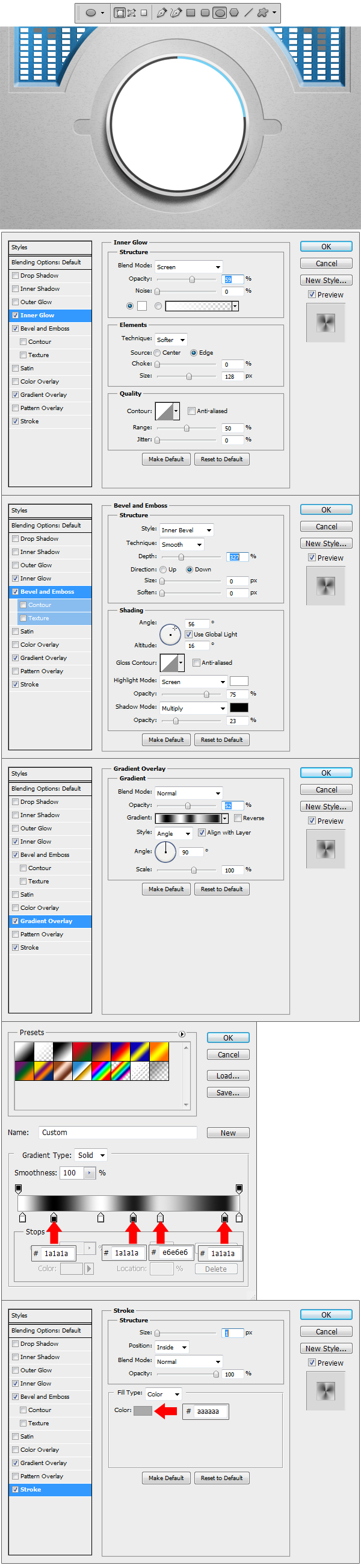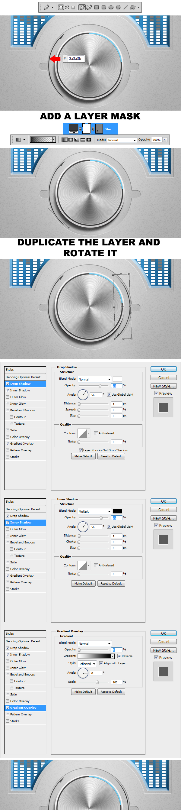 Using Rectangle Tool (U) make 4 shapes like the ones indicated in the example and set the fill color to #474747. Using Rectangle Tool (U) make a small rectangle shape just between the two upper strokes done before. Set the fill color to #92a1ab. Now using Ellipse Tool (U) make another circle just like the one in the example, set the fill color to #83898f and using Elliptical Marquee Tool (M) make a circular selection inside the shape we’ve done before exactly like the one in the example. Now select inverse and Add a Layer Mask. Apply the Layer Styles and move to the next step.