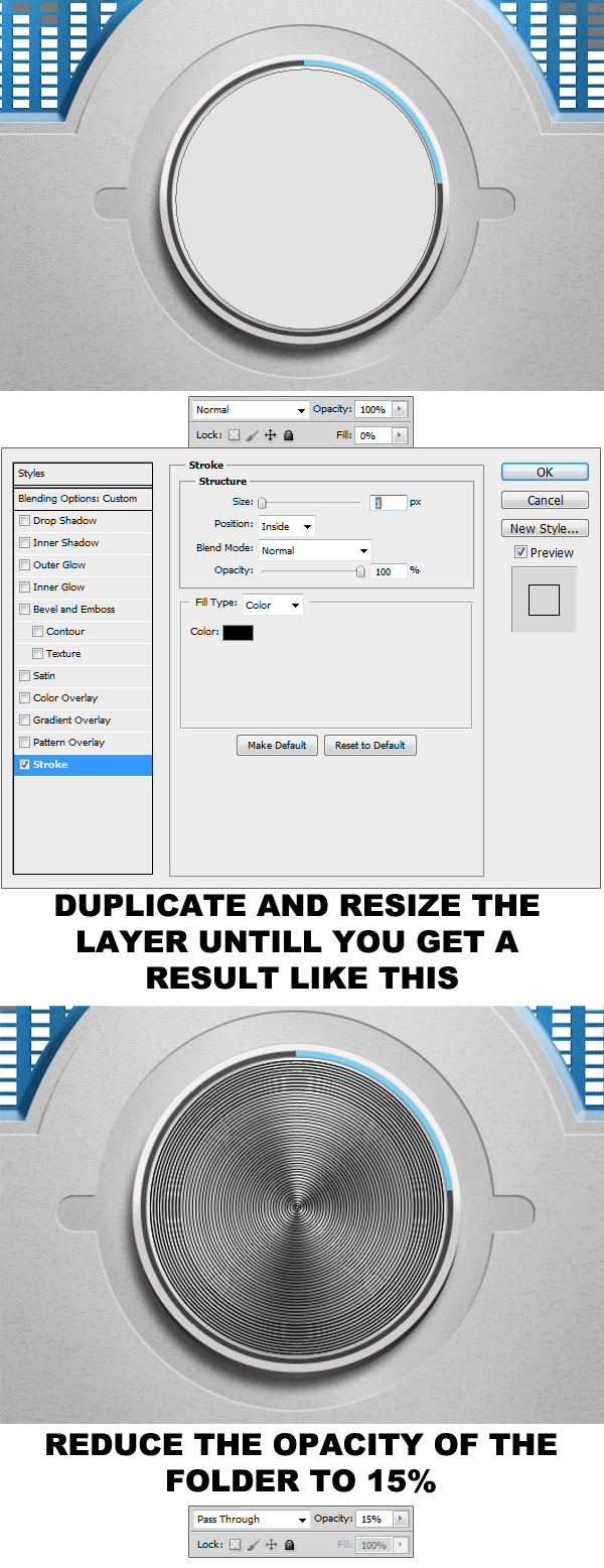 Using Ellipse Tool (U) make another circle like the one in the example. Set the Fill to 0 and apply the Layer Style. Duplicate and resize this layer until you get a result like the one in the example. Add all this layers in a root folder/group and reduce the groups Opacity to 15%.