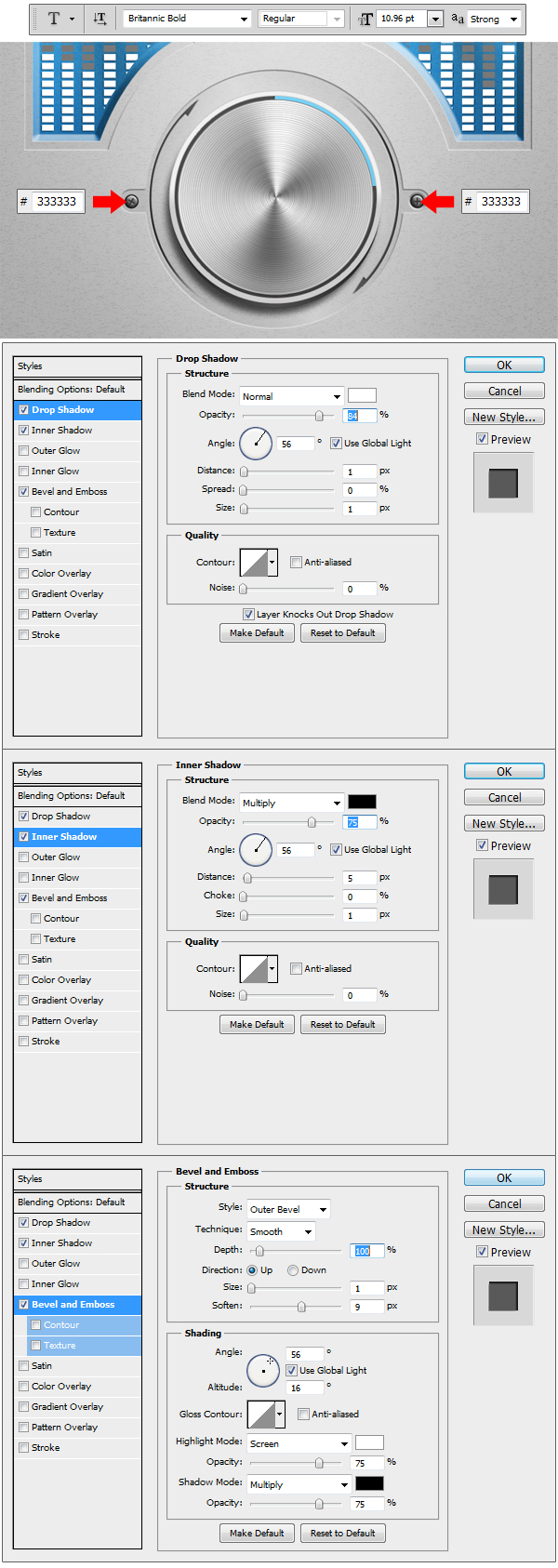 Using Horizontal Type Tool (T) set the font to Britannic Font and the size to 11 pt and type two “+” just like in the example. Apply the Layer Styles to them and our screws are done.