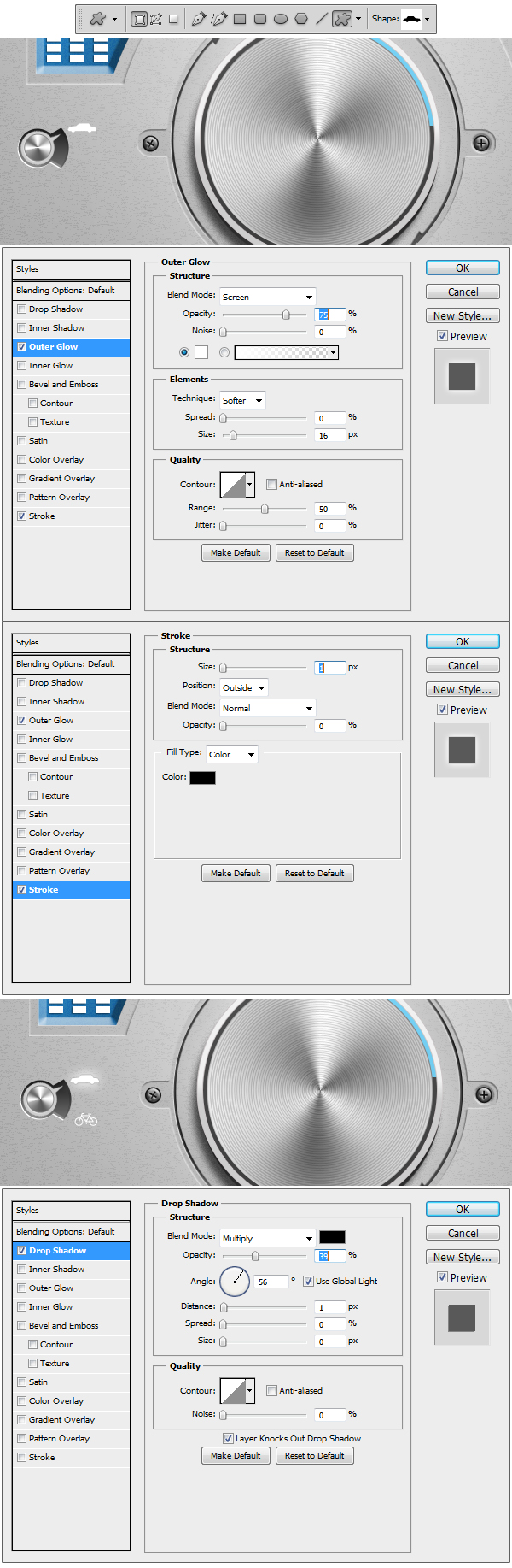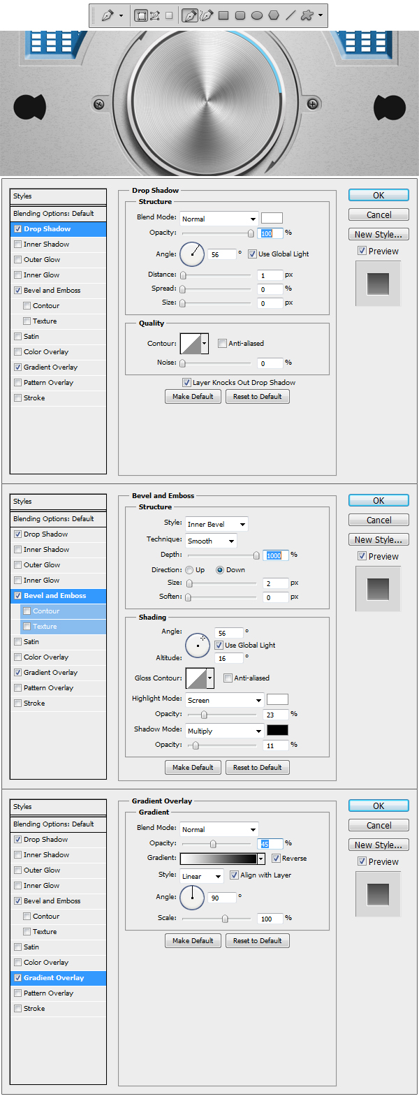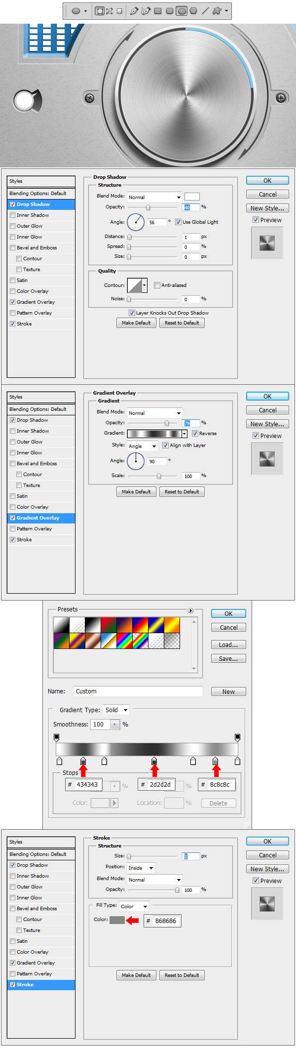 Create a new group and name it Knob. Using Ellipse Tool (U) make a black #000000 circle like the one in the example. Drop the Fill to 8%. Now using Pen Tool (P) set to Paths make a selection just like the one in the example and add it as a layer mask. Apply the Layer Styles and move to next step.