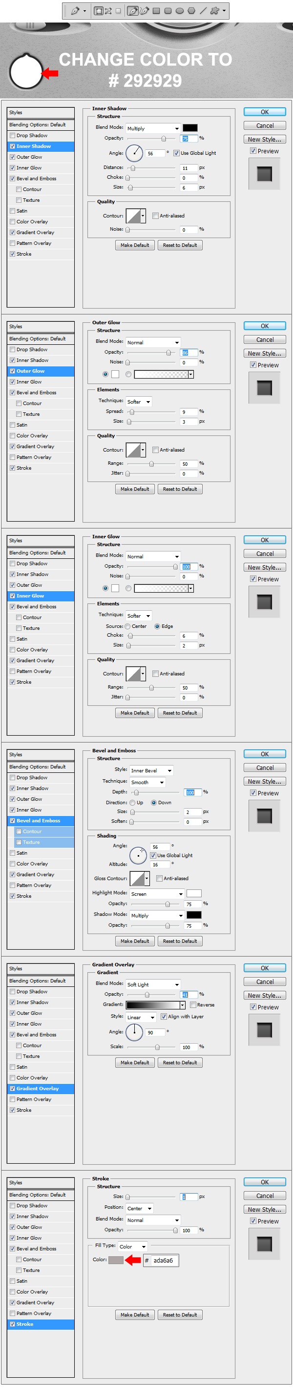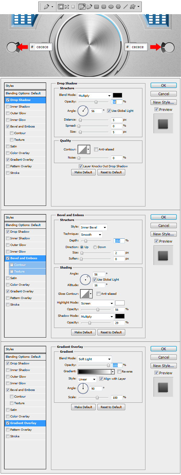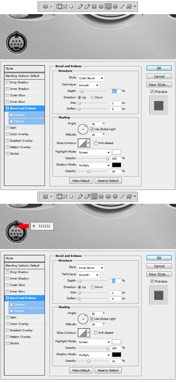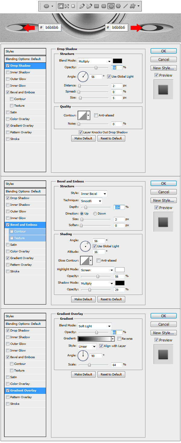 Using Ellipse Tool (U) make two shapes like the ones in the example. Set the fill color to #b6b6b6 and apply the Layer Styles.