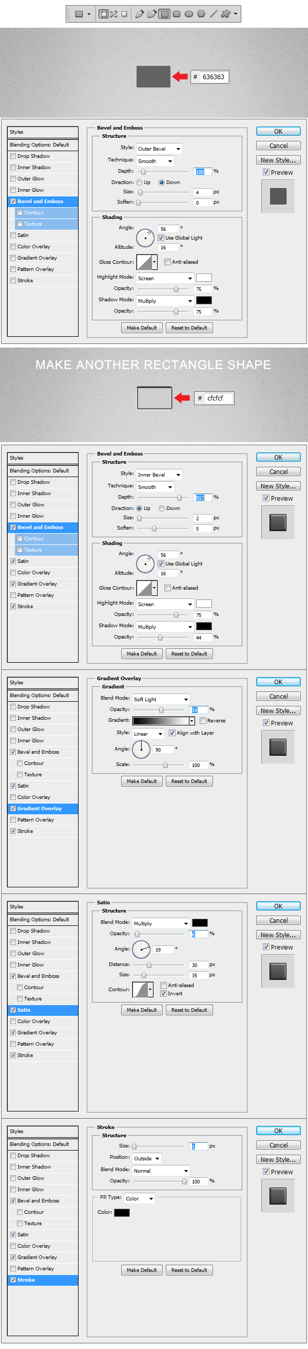 Create a new Group and name it Side Button. Using Rectangular Tool (U) make a rectangle shape just like the one in the example. Set the fill color to #636363 and apply the Layer Style. Now take the Rectangular Tool (U) and make another rectangle shape, this time a little smaller than the previous one and set the fill color to #cfcfcf afterwards apply the Layer Styles.