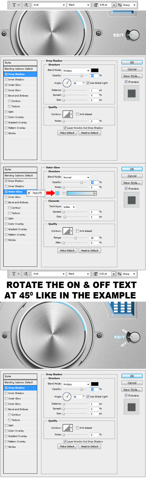 Using Horizontal Type Tool (T) set the font to Arial and the font size to 9 and write “EDIT” just like in the example and apply the layer styles. Now use a smaller font and write at a 45 degree angle the words ON and OFF and apply the Layer Style.