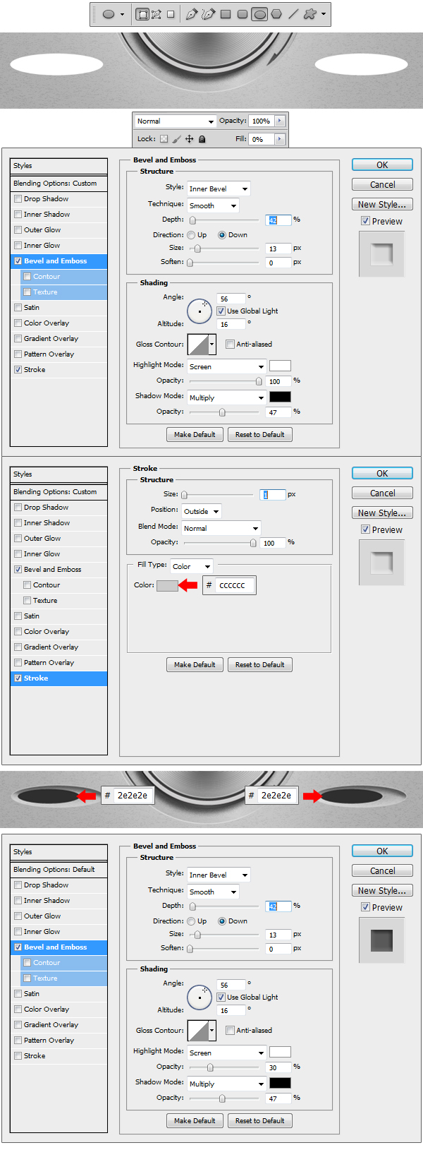 Make a new group and name it Switches 2. Using Ellipse Tool (U) make to shapes like the ones in the example. Set the fill to 0% and apply the Layer Styles. Use Ellipse Tool (U) once again and make two shapes like the ones in the example. Set the color fill to #2e2e2e and apply the Layer Style.