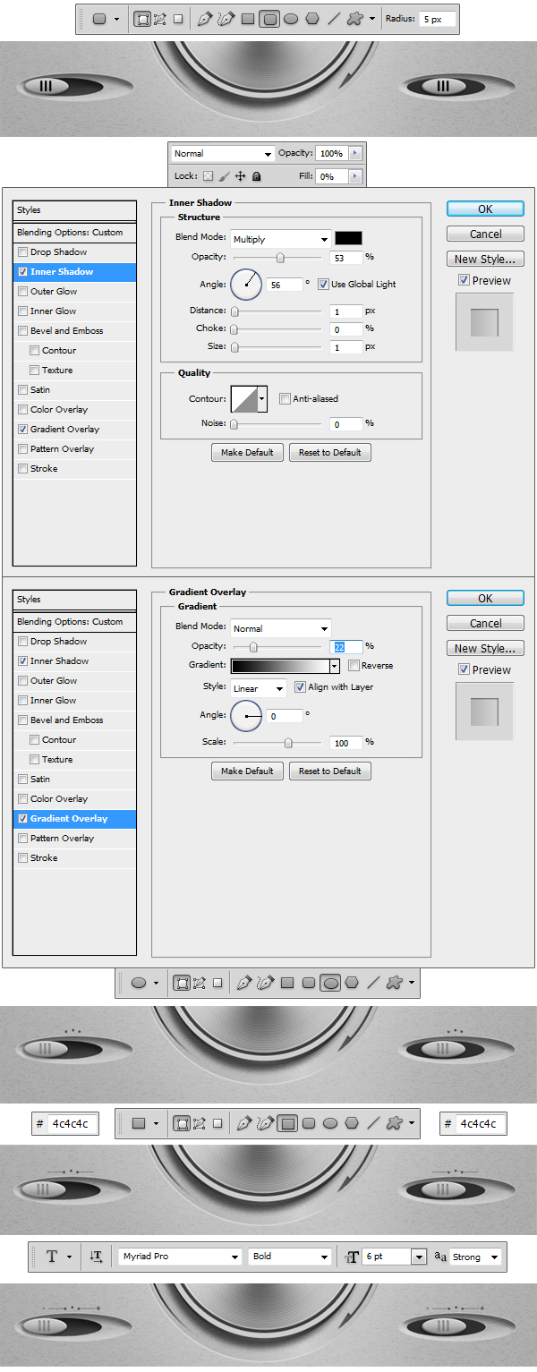 Using Rounded Rectangle Tool (U) set the Radius to 5 px and draw six shapes just like the ones in my examples. Set the Fill to 0% to all the layers and apply the Layer Styles. Now using Ellipse tool set the color to #4c4c4c and make 6 circles like in the example. Using Rectangular Tool (U) and the same color make 4 shapes just like the ones in the example. Now you will have to use Horizontal Type Tool (T) and set the Font to Myriad Pro / Bold and the font size to 6 pt and write at the end of each group a