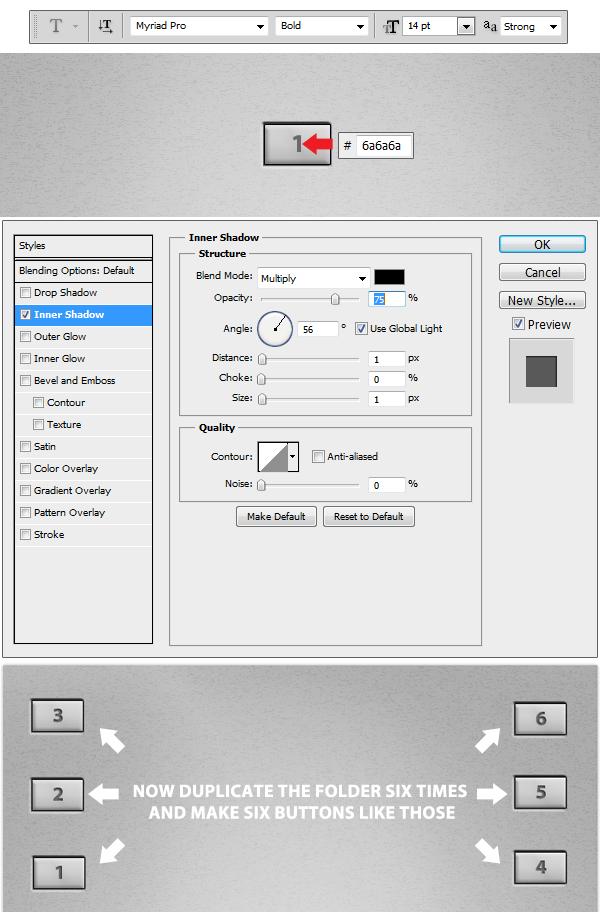 Using Horizontal Type Tool (T) set the font to Myriad Pro (standard font) / Bold and the size to 14 and type the number 1 in the center of the shape. Apply the Layer Style and duplicate the Side Button Group like in the example and change the text number of each shape.