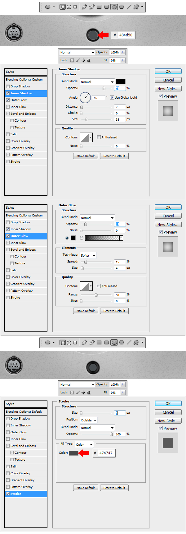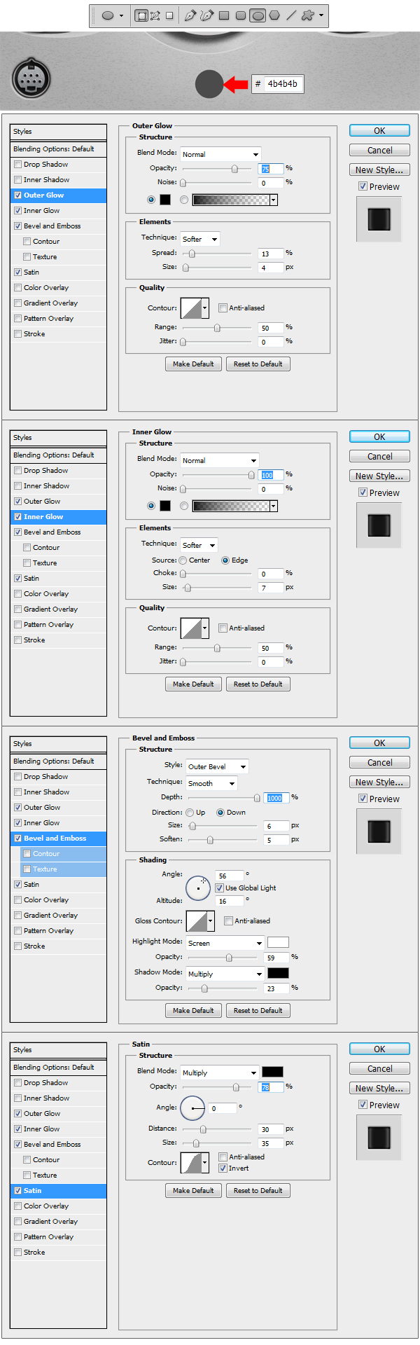 Make a new Group and name this one Jack. Using Ellipse Tool (U) make a circle like the one in the example set the fill color to #4b4b4b and apply the Layer Styles.