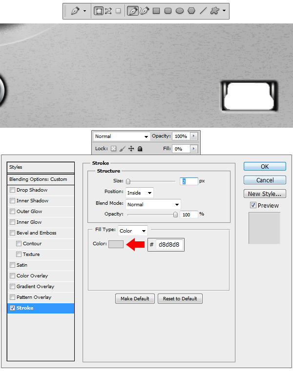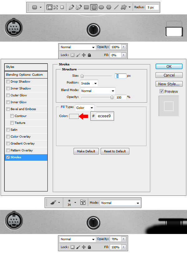Create a new layer and transform it in to a Clipping Mask. Using Rounded Rectangle Tool (U) set the Radius to 5px and make a shape just like the one in the example. Drop the Fill to 0% and apply the Layer Style. Make a new layer and using a medium and a small size black #000000 brush make two strokes like the ones in the example. Transform this layer in a Clipping Mask and reduce the Opacity to 70%.