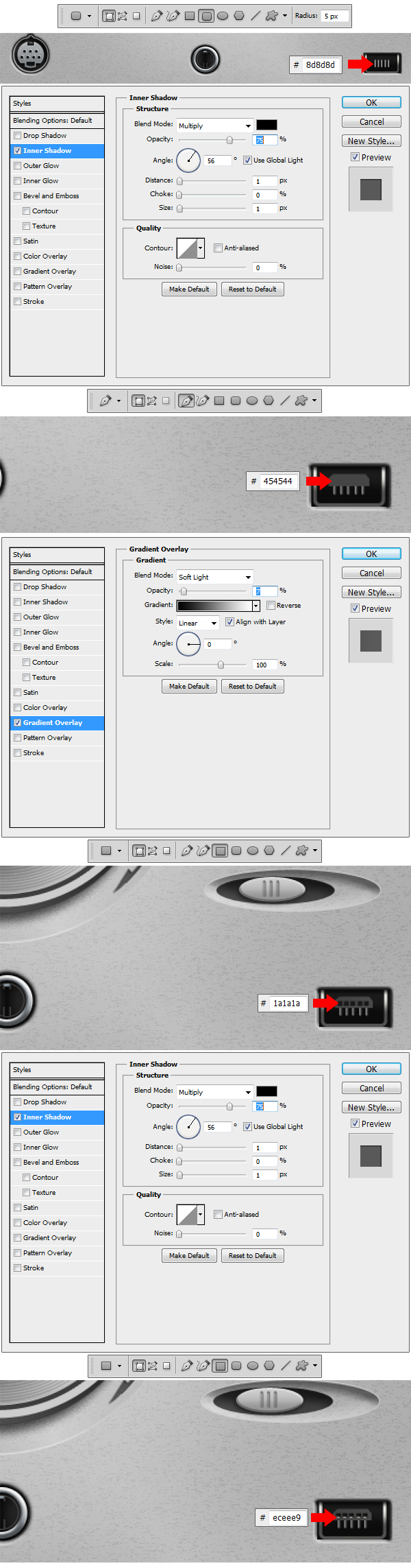 Create a new group and name it USB Connector. Using Rectangle Tool (U) make a shape like the one in the example and set the fill color to #1f1f1f. Apply the Layer Styles and we’re done.