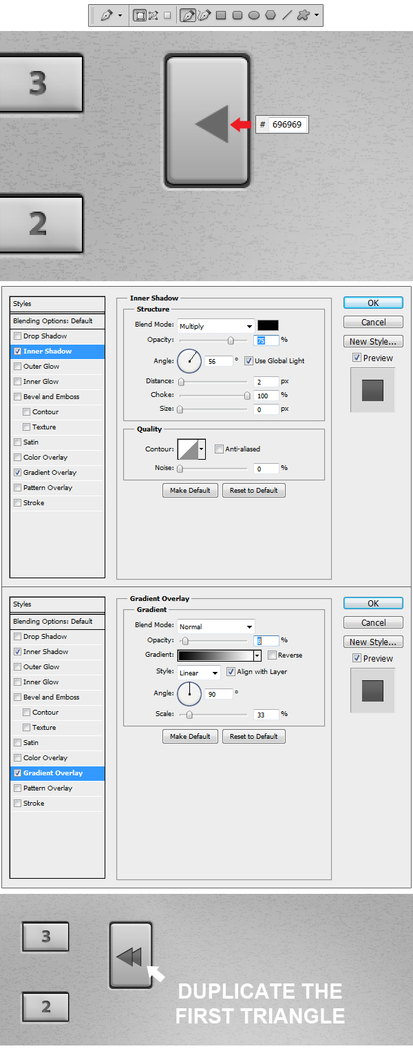 Using Pen Tool (P) we will make the symbol. Draw a triangle and set the fill color to #696969, apply the Layer Styles and duplicate the shape like shown in the example.