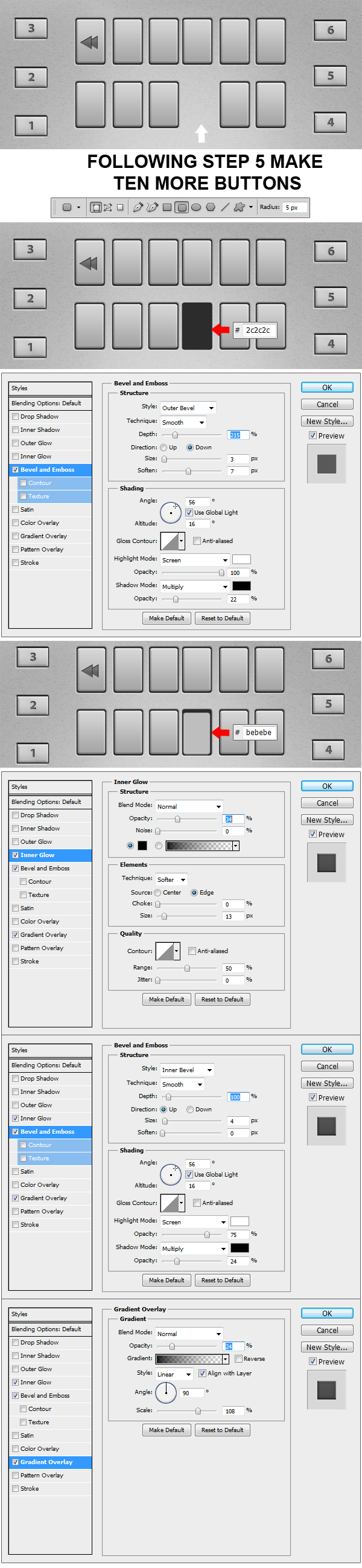 Make ten more buttons following Step 5 and leave an open space for the pressed version of the buttons. Using Rounded Rectangle Tool (U) you will make another shape in the space left between buttons. Set the color to #2c2c2c and apply the Layer Style. Now make another shape using Rounded Rectangle Tool (U) this time a little smaller, like the one in the example and apply the Layer Styles.
