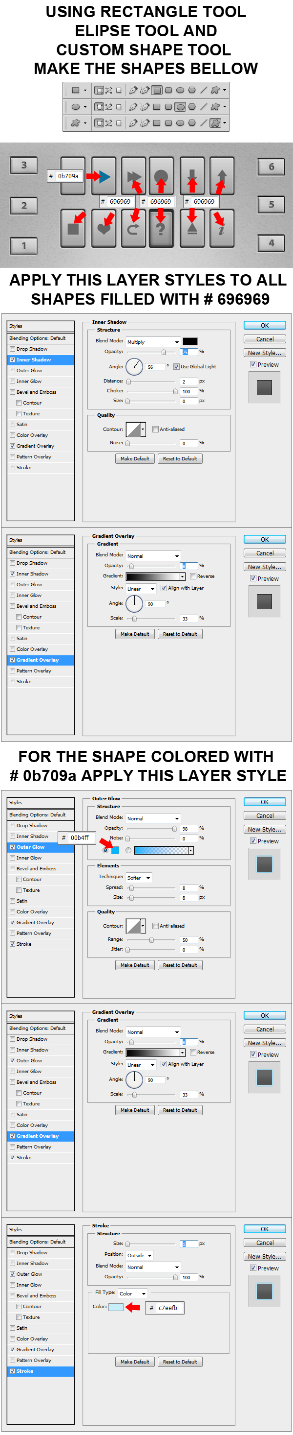Using Rectangular Tool (U), Ellipse Tool (U) and Custom Shape Tool (U) draw the following shapes. Set the fill color to all shapes to #696969 except to the play symbol which we will color in #0b709a. To all the shapes colored with #696969 apply the first set of Layer Styles and to the play symbol apply the last set of Layer Styles.