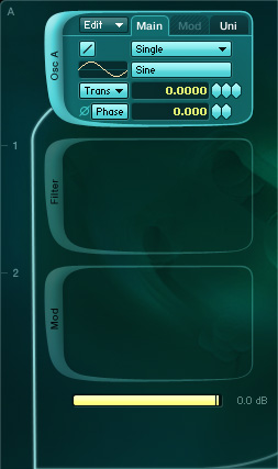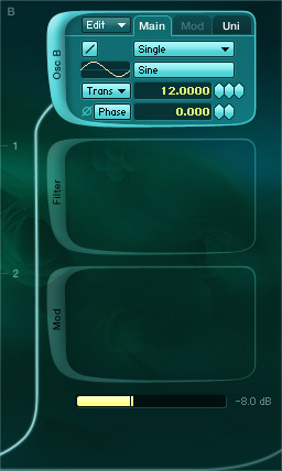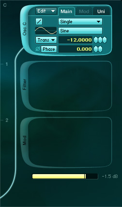 Open Absynth and create a new sound. In a Patch window, there is only OSC A active with its default parameters. Enable OSC B and change the Trans value to 12. Set the output volume of this Oscillator to -8dB. Finally Enable OSC C and set Trans to -12 and the volume to -1.5dB. You’ll get a fuller sound in two octaves. This heartbeat sound works best in a low range around C1.