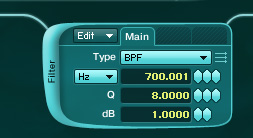 Now add BPF Filter and set Hz to 700, Q to 8 and dB to 1.