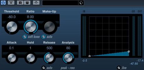 As before, we need to first apply some ridiculously heavy compression, so I’ve turned up the input gain and the ratio as high as they will go, and lowered the threshold right down. Reduce the attack time to the shortest possible, then creep it up so that ‘pop’ starts to come through like this: