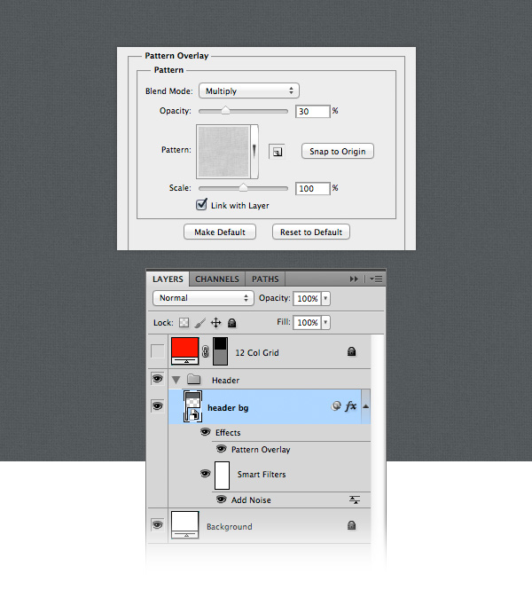 Download this pack of fabric patterns and open the .PAT file in Photoshop. Then double-click on the "header bg" layer to open the Layer Style window and add a Pattern Overlay effect with the settings from the image below and a pattern from the pack you downloaded.