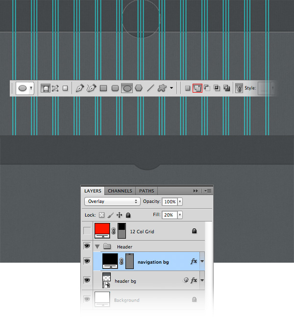 Click on the vector mask of the "navigation bg" layer to make it active. Then using the Ellipse Tool, hold down the Shift key and create a circle in the middle of the navigation bar with the radius 140px. Take a look at the following image for reference.