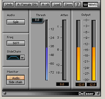 You may find there is a strong vocal sibilance after adding the EQ and compressor. You can resolve this using Waves DeEsser. For example it is controlled using the female shh preset below.