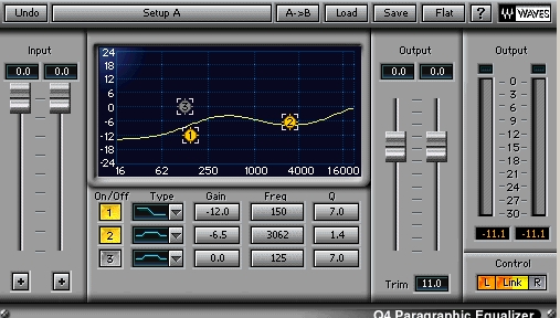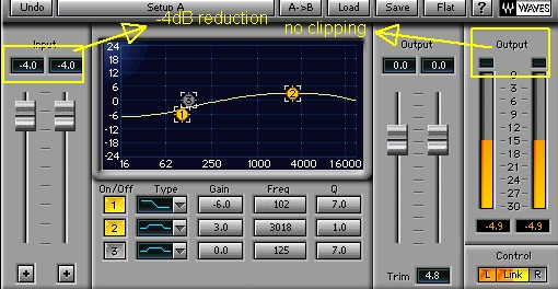 Watch the output meters of the Q3 Paragraphic EQ for clipping. If a clipping occurs, lower the input (in this case, it is lowered to -4 dB) until there is no clipping on the output throughout the vocal tracks.