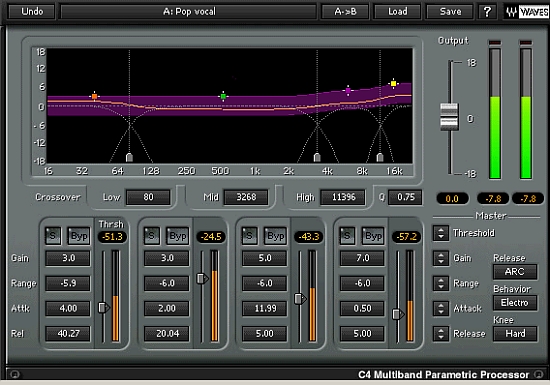 You can then compress the vocals after EQ. In this case, add the Waves C4 effect next to the Q3 Paragraphic EQ. Then use the “Pop Vocal” preset at first. This is the recommended starting preset for pop, rock and country vocals.