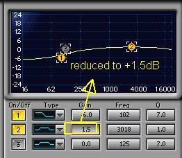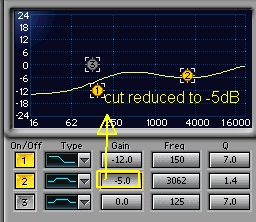 Check if other instruments are not too buried in the mix. You can decrease the amount of dB cut at 3000 Hz. For example for guitars, you might want to reduce the dB cut from -6.5 dB to -5 dB. Always use your ear to determine the optimum adjustments.